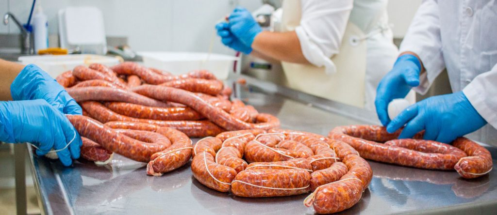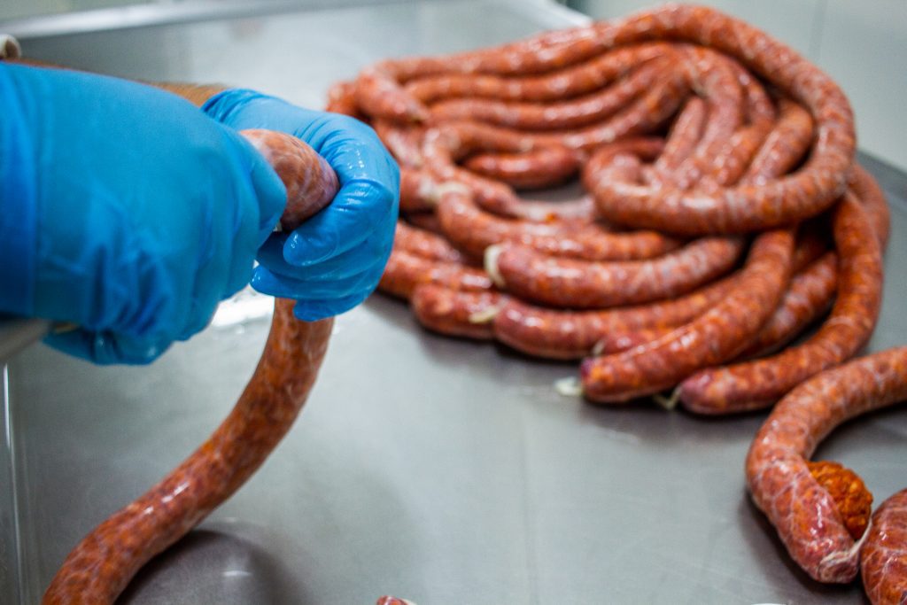Acto seguido, la masa pasa a las embutidoras, donde utilizamos exclusivamente tripa natural. Este es un punto innegociable en nuestra producción. La tripa natural permite que el chorizo «respire» durante la curación, algo que las fundas sintéticas no pueden imitar.