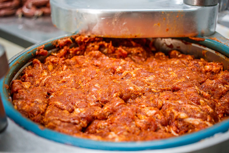 Posteriormente, procedemos al picado. A diferencia de los procesos industriales que trituran la carne hasta hacerla irreconocible, en nuestra fábrica de Los Vélez mantenemos un calibre de picado que permite al comensal distinguir la nobleza del magro. Este detalle es fundamental para la textura final, aportando una «mordida» auténtica y tradicional.